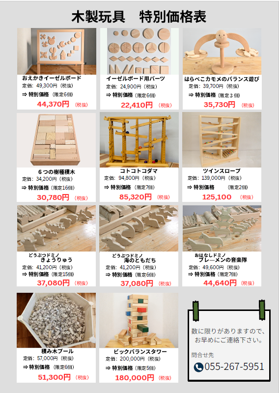 2026年2月5日 / 最終更新日 : 2026年2月5日 manage1 お知らせ&イベント情報 【数量限定】大型木製玩具を特価でご提供 木製玩具の導入したいとお考えの皆様 日頃のご協力の御礼に、 3月末までの期間中、数量限定で 集団遊びに最適な大型木製玩具を特価でご提供いたします。 4月以降、現在の木製玩具の値上げを予定しておりますので、ご購入は今がチャンスです。 特別価格の木製玩具のラインナップ及び限定数につきましては下記の表をご確認ください。 御見積、ご請求書、納品時期、支払い方法などについてのご相談も承っております。 お気軽にお問合せ下さい。 \ 最新情報をチェック / FacebookXBlueskyHatenaCopy