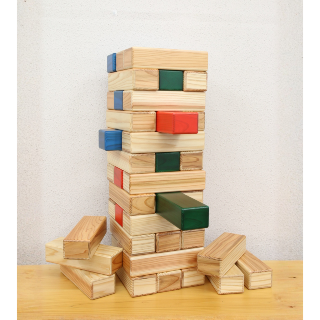 1つのブロックが24㎝幅のビックサイズのバランスタワーです。積み上げていくと大人の背丈も超えそうなジャンボサイズ。一つ一つ板を組み合わせて作ったピースのため、見た目に反した軽さに驚く方も多いです。