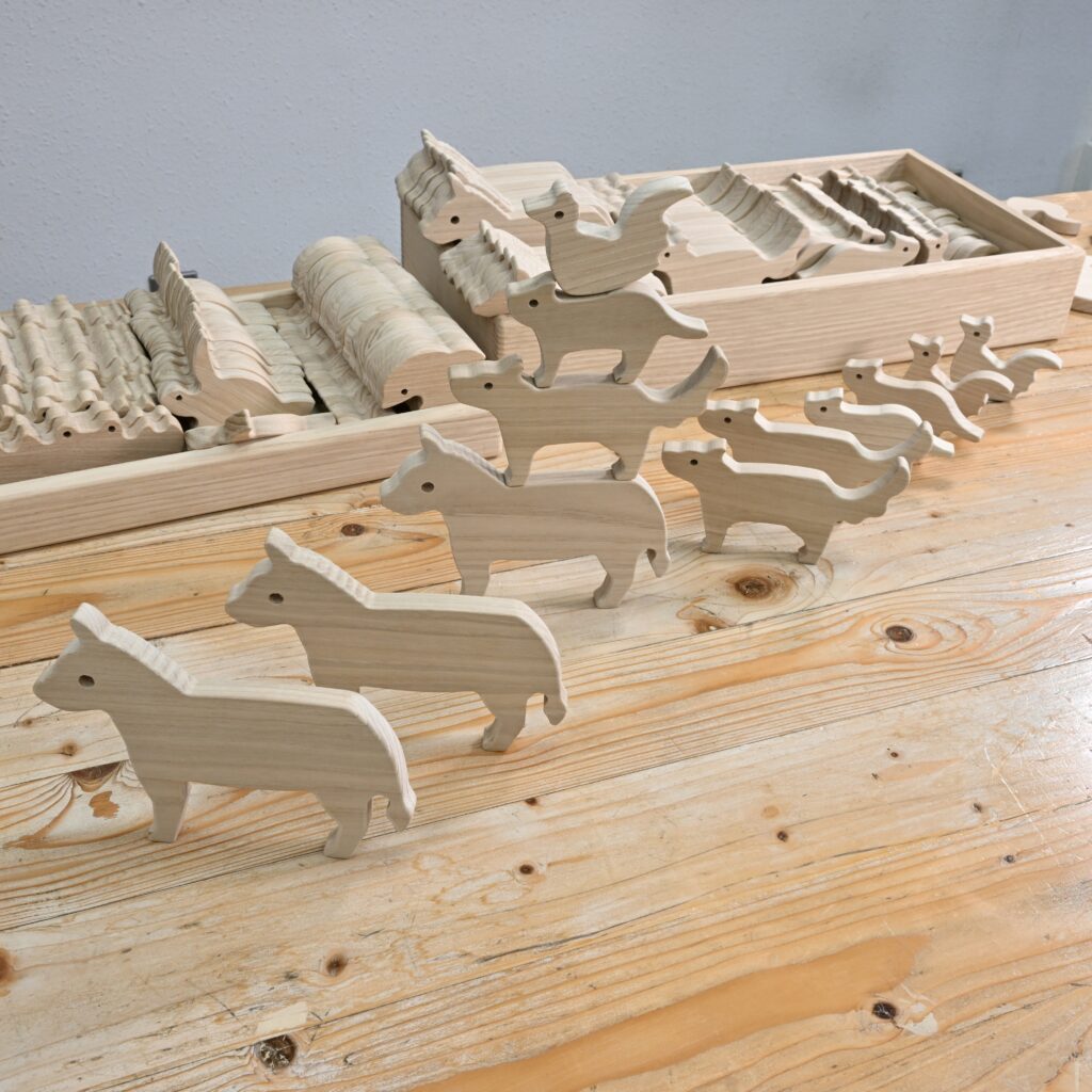 童話 「ブレーメンの音楽隊」に登場するキャラクターをモチーフにしたドミノ。並べて倒すだけでなく、詰めるようにも設計し、物語のクライマックスも再現できます!