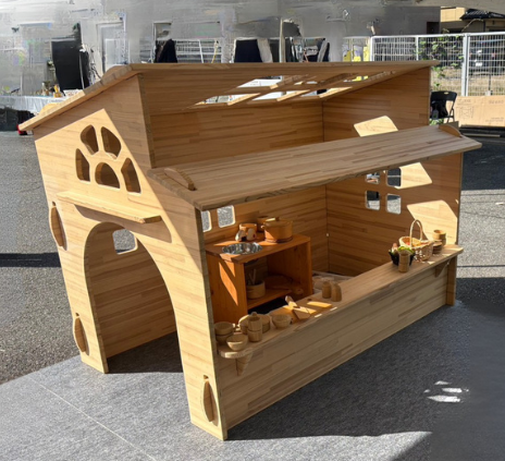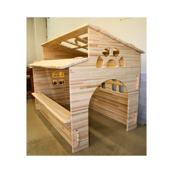 子どもたちが入りたくなる温もりのあるパネルハウス。屋根の猫の図柄がアクセント!